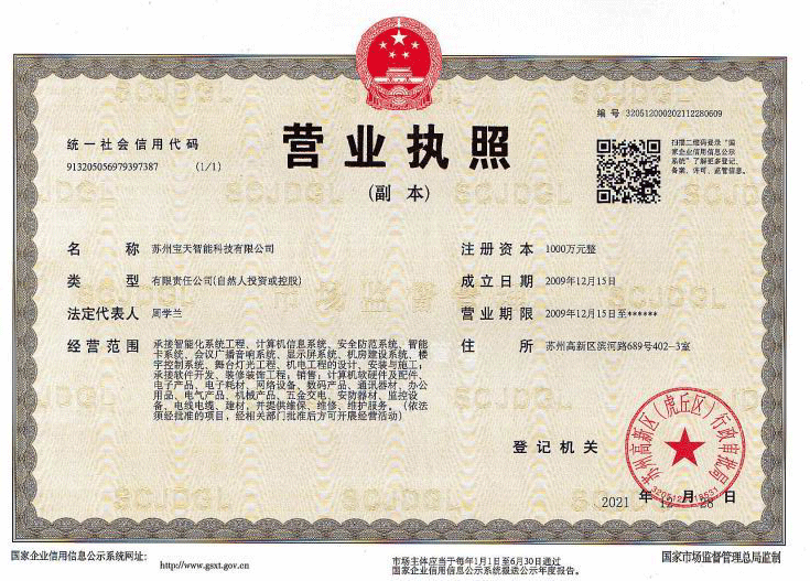 蘇州寶天智能科技有限公司,專業從事廠房、辦公智能化、信息化、安防智能化系統的實施。有數名本專業執業人員,公司實行細致的項目前期溝通、規劃,負責的項目管理、過程控制,良好友善的售后服務,多年來成功實施了眾多智能化、信息化、安防等項目。